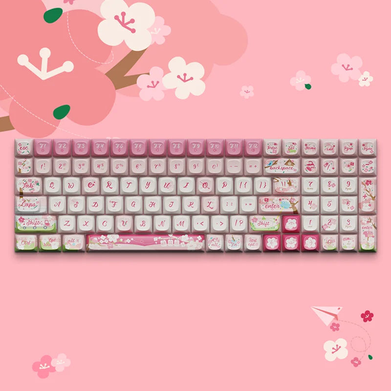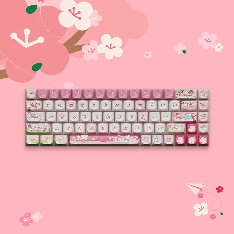 Inspired by the enchanting peach blossoms, a symbol of thriving romance in Chinese culture, our "Blossom Love" keycaps make every keystroke a step toward love. The Shift key features a truck brimming with blossoms, symbolizing love’s imminent arrival. Cupid’s arrows poised on the Alt keys and a love letter further invite romance. The Enter key’s wind chime under a peach tree sways with wishes for love, while pink hues of spring express a yearning for pure affection, making this set a poetic celebration of love's blossoming promise.