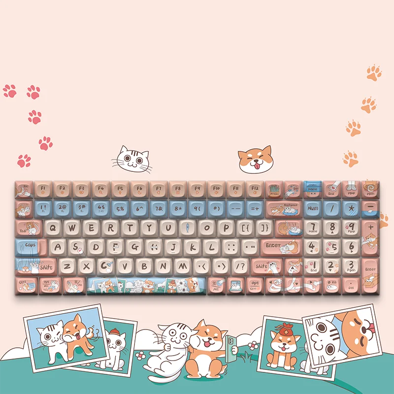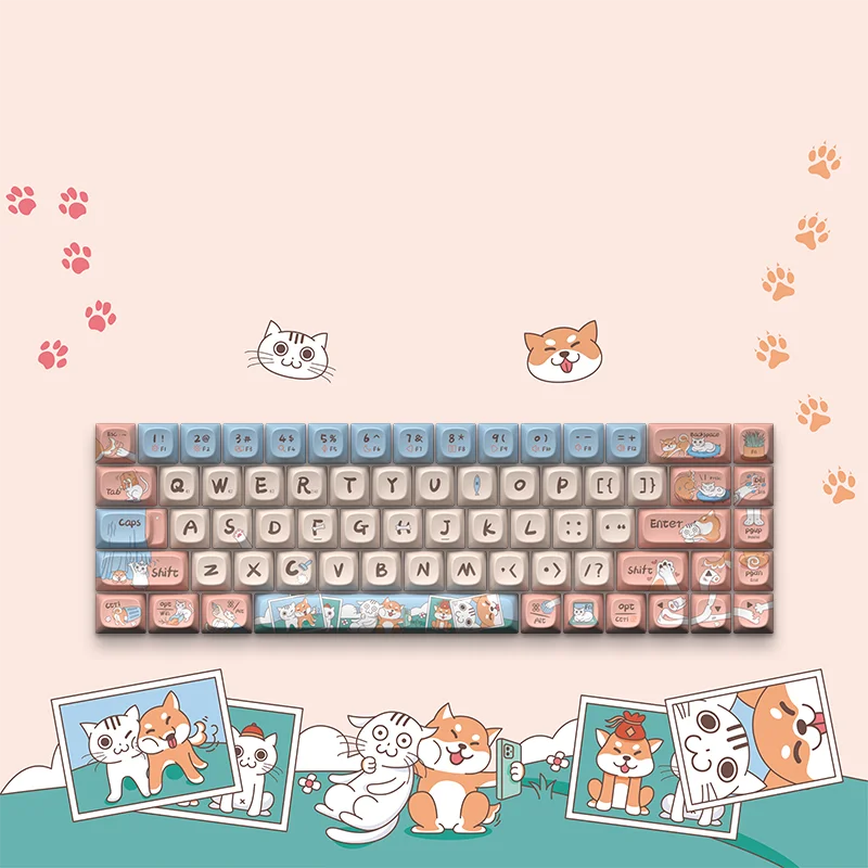 "Cat and Dog are Friends" extends the adorable style of "Cute Kitty" with a new, enthusiastic, and adorably goofy Shiba Inu companion. Designed to capture the unique interactions and affections between cats and dogs, these keycaps feature charming illustrations that depict their loving yet playful everyday antics. The set of keycaps tells a small story, enabling you to feel the magic of this special friendship as you type.