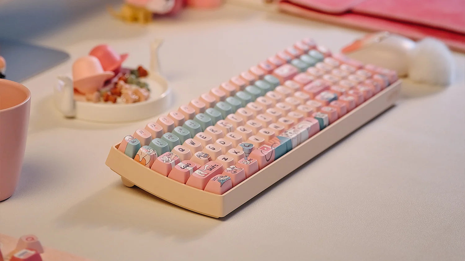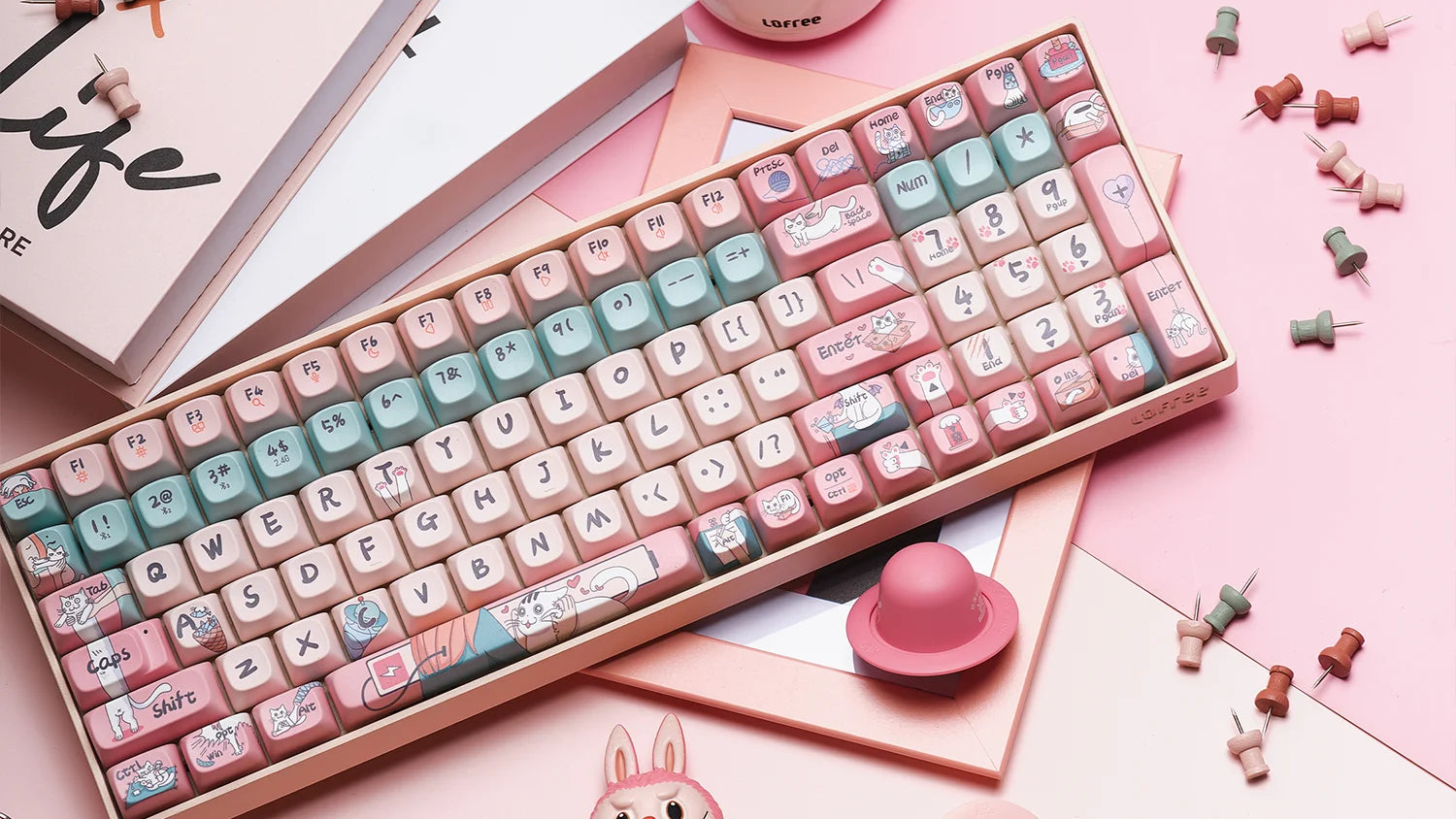 In a world that craves warmth, it's not just us who need kittens, but rather, we who cherish their company. Our "Dear Kitty" keycaps are dressed in adorable pink, reflecting the cuteness of kittens. Featuring designs of playful toys, cozy cat trees, and endearing paw prints, this set of keycaps celebrates the delightful bond between cats and their owners, turning your typing experience into an encounter filled with love and feline charm.
