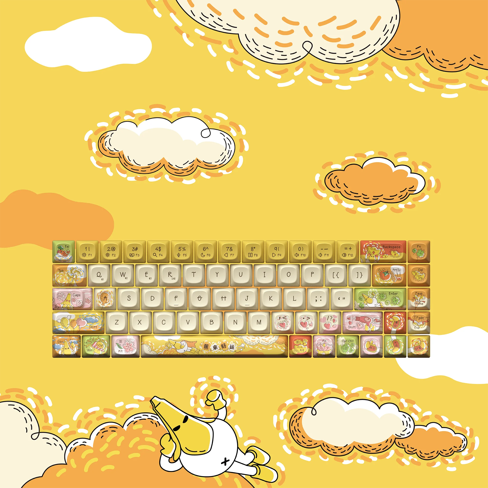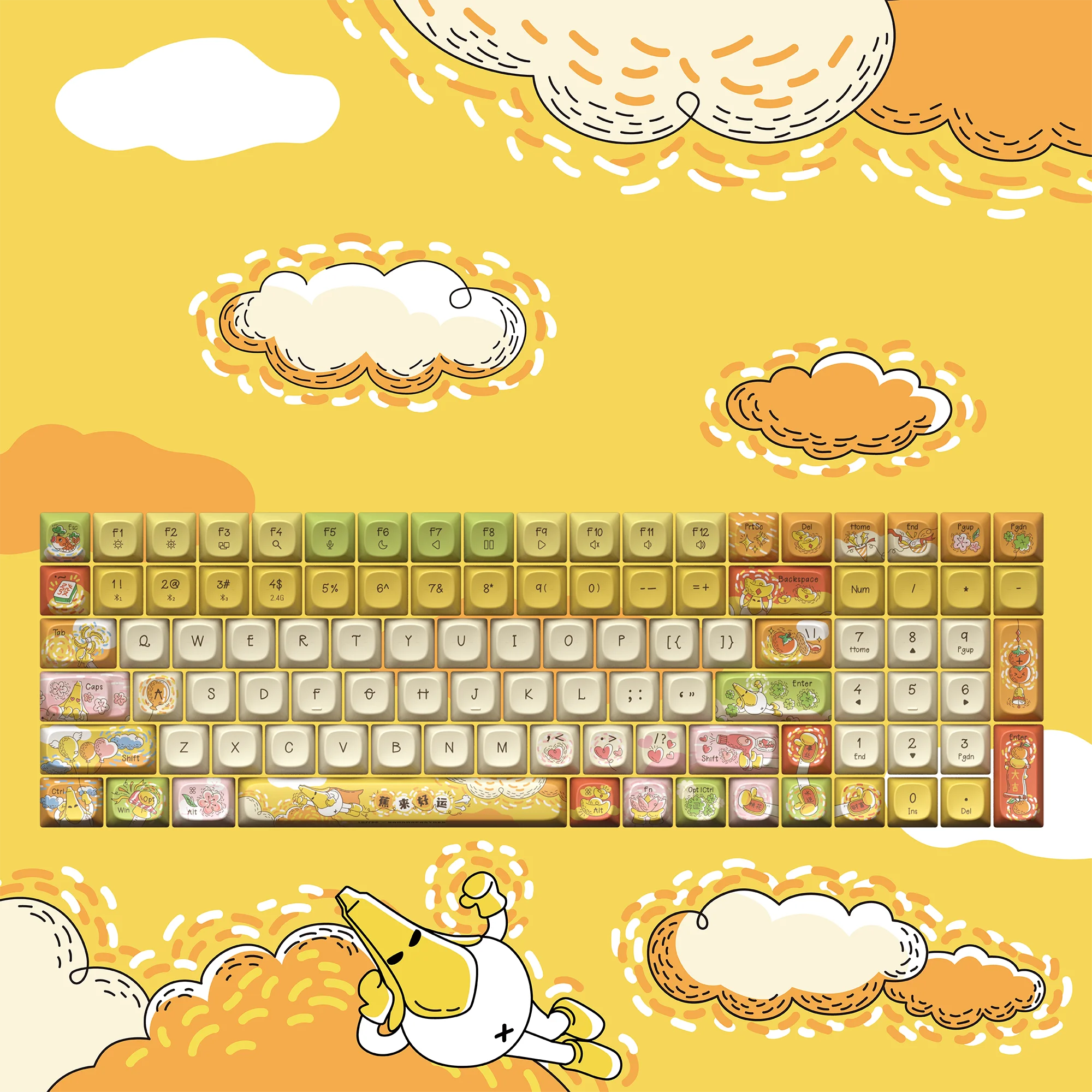 Featuring "Lucky Banana," the beloved icon from Banana Design. This design showcases Banana Head in its classic beckoning pose, a symbol of welcoming Fortune in China. The set of keycaps also blends some elements from traditional Chinese culture believed to attract luck: oranges for immense fortune, the beckoning gesture with gold coins and ingots for financial prosperity, four-leaf clover for good fortune and peach blossoms with hearts for love luck. This set of keycaps promise to bring a flow of luck into your daily life.