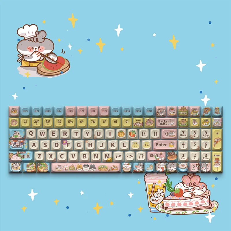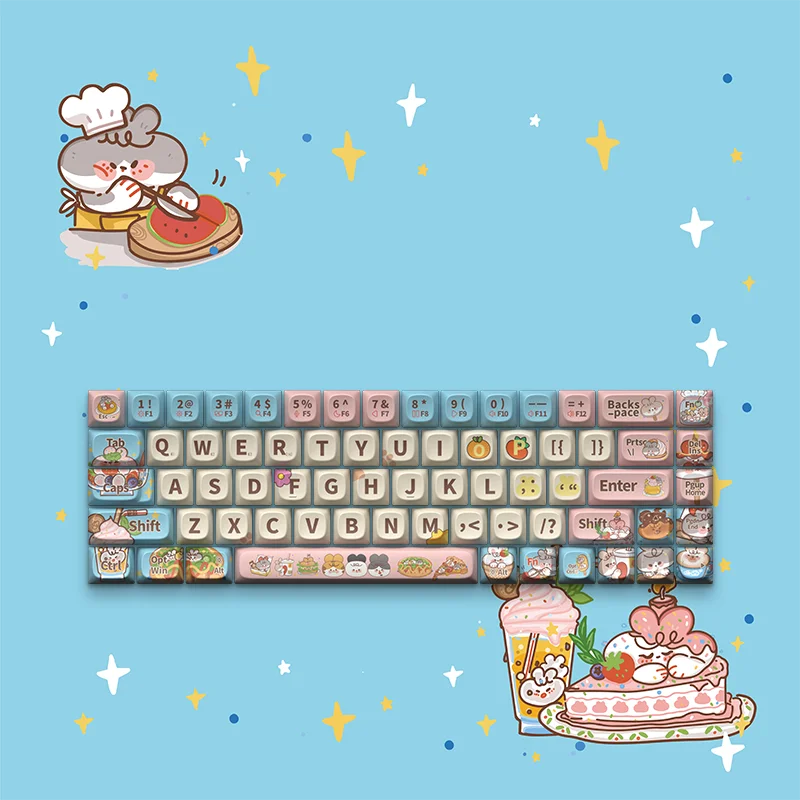 Indulge in the delightful fusion of rabbit and culinary themes with our "Rabbit Chef's Feast" keycaps. They feature cute rabbit designs paired with favorite snacks like milk tea, hamburgers, pizza, candy, and donuts. The lively pastel blue color scheme enhances the girlish, making every keystroke dreamy and sweet.