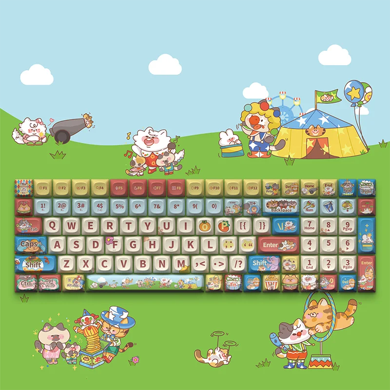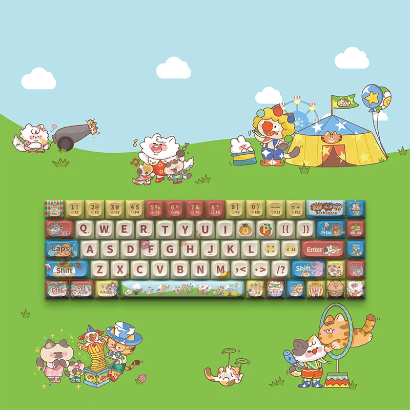 Step right up to the whimsical world of our "Cats' Paradise" keycaps, where cats are the stars of the Circus. From acrobatic antics and magical illusions to singing sensations and hoop-jumping trainers, these keycaps feature colorful, lively depictions of cats in various circus roles. The primary colors of red, yellow, and blue enhance the playful and dynamic vibe,Bringing the joy of a circus right to your fingertips with these vibrant and amusing keycaps.