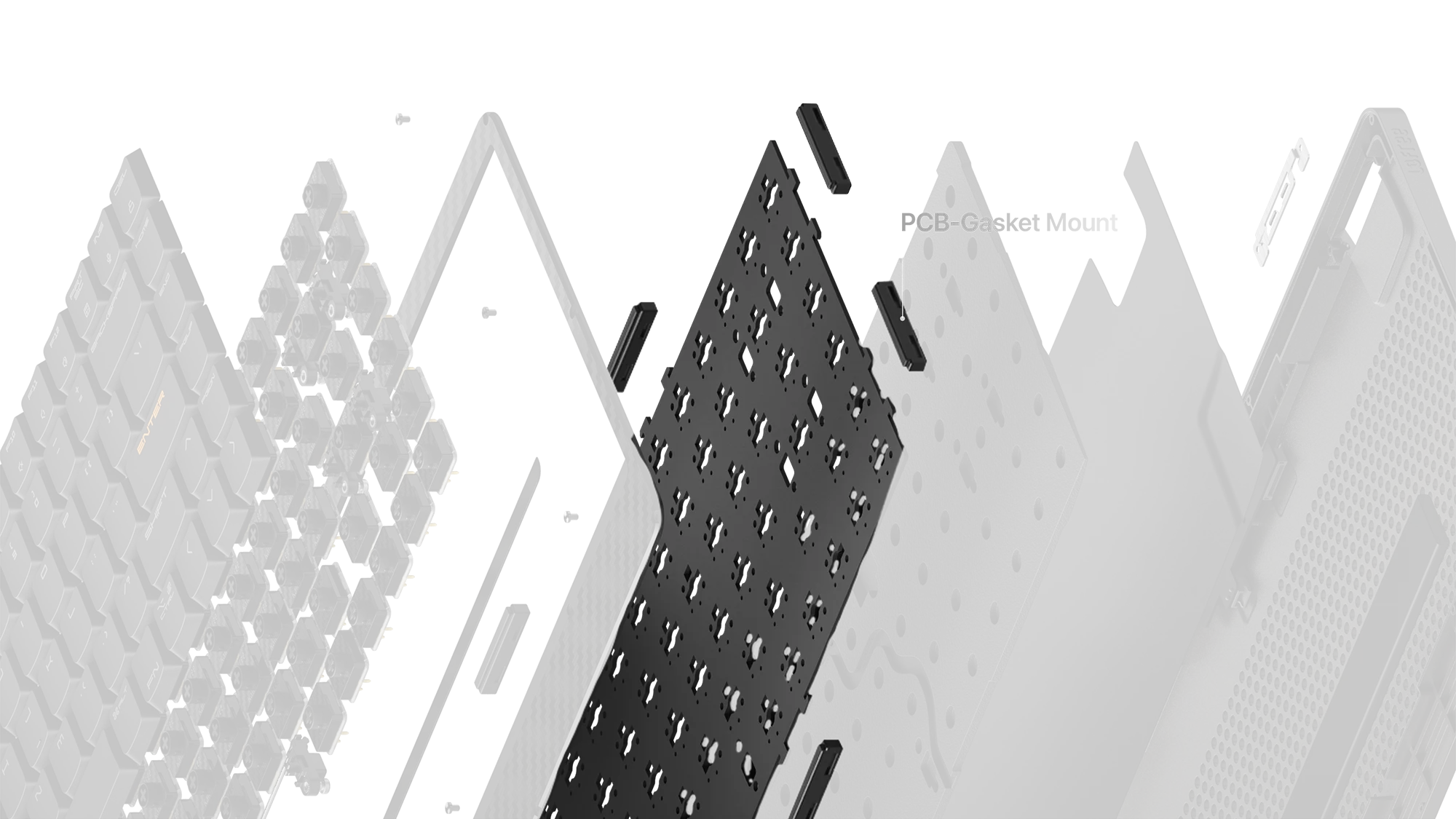 To honour our commitment to creating mechanical keyboards that offer superior typing experience in a slimmer and lighter design, an innovative PCB-Gasket structure is featured in Edge keyboards. To conquer the challenge of space constraints, solder-mounted switches are used and gaskets integrated are strategically positioned directly into the PCB. Instead of silicone, the inner cavity of shell is filled with special-shaped foam material,which is less weight and works incredibly well in noise reduction. Edge is a perfect choice in quiet public areas such as libraries.