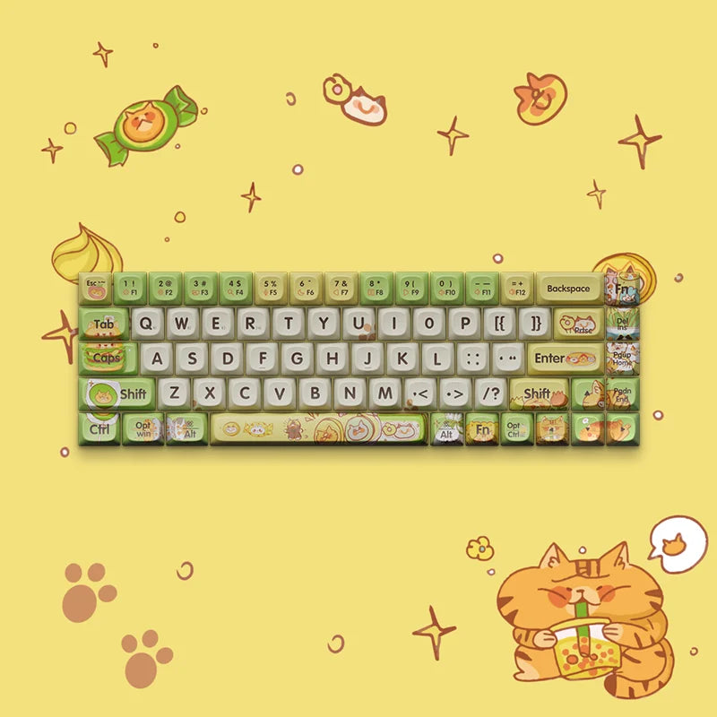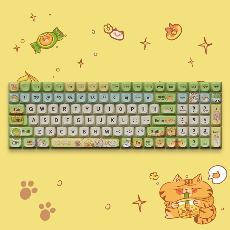 Indulge in the delightful fusion of cats and culinary food with our "Greedy Cat" keycaps. Featuring cut cats paired with favorite snacks like burgers, soda, candy, and cookies. The lively yellow and green color scheme enhances the fresh, fun vibe, making every keystroke an enjoyable and vibrant experience.