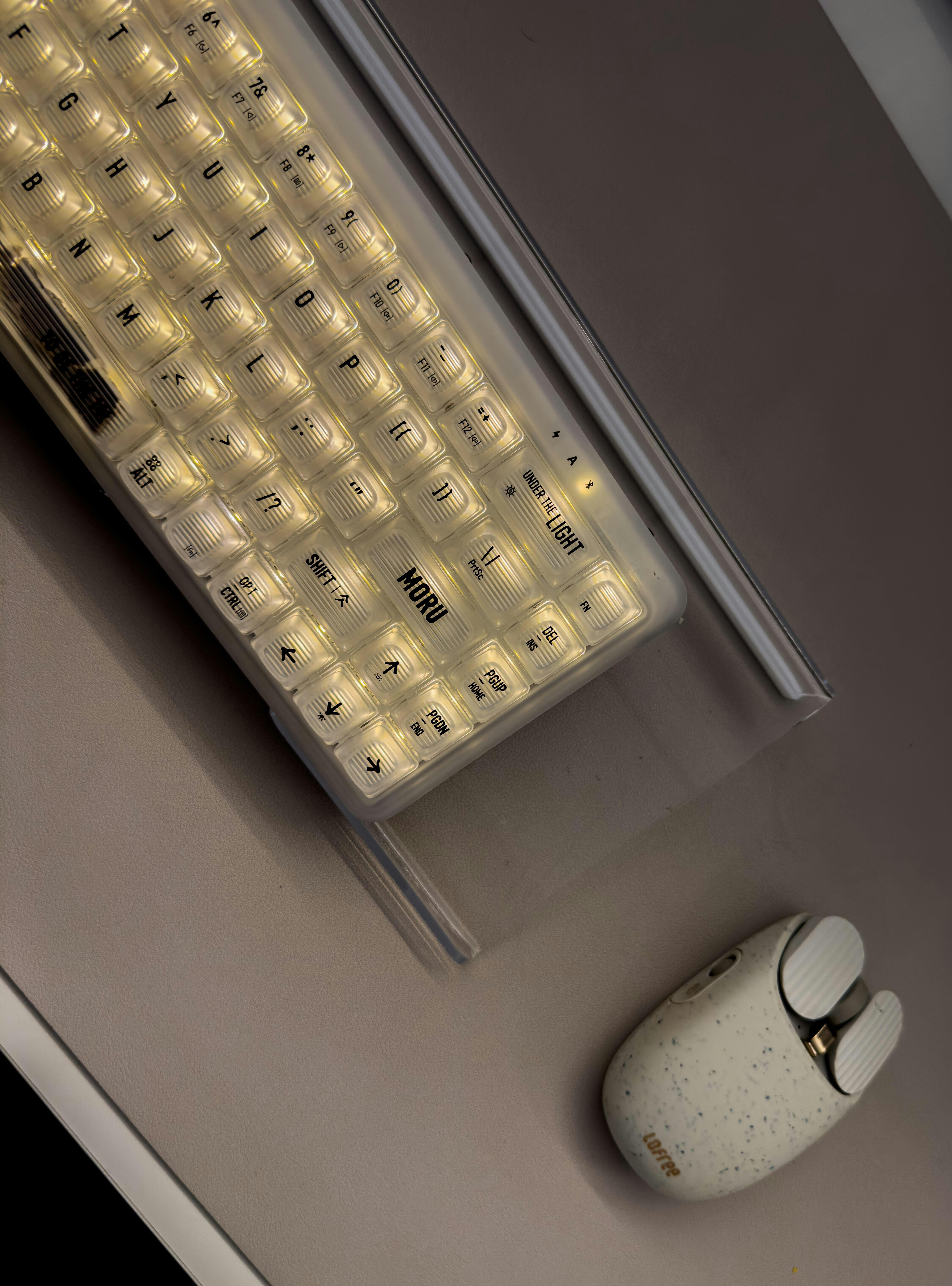 With its reeded glass texture keycap, and 7 lighting modes soothing warm yellow backlights, the 1% Moru is more than a keyboard —it's tool to give you an atmosphere of warmth and creativity. Experience warmth and creativity with the 1% Moru keyboard — more than just a keyboard, it's your tool to a serene atmosphere.