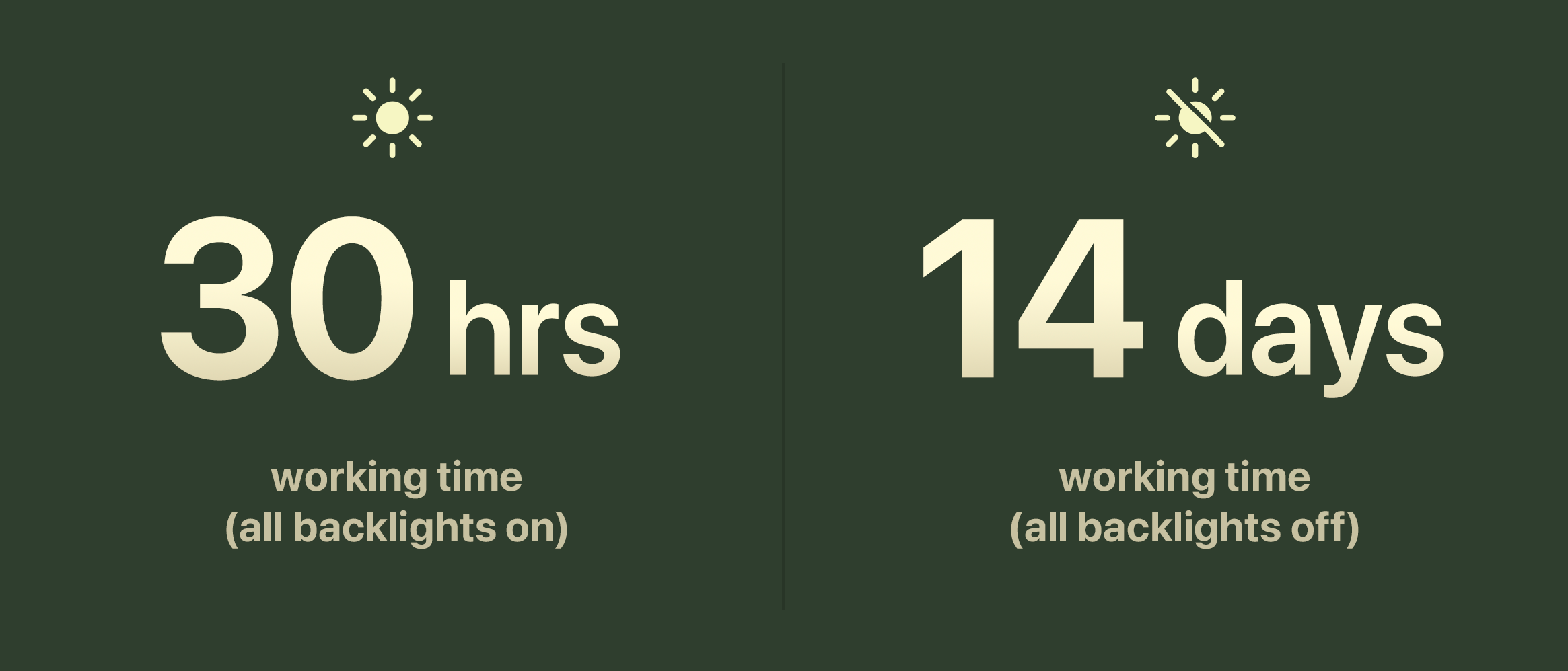 Working Time (all lights off): Up to 14 days