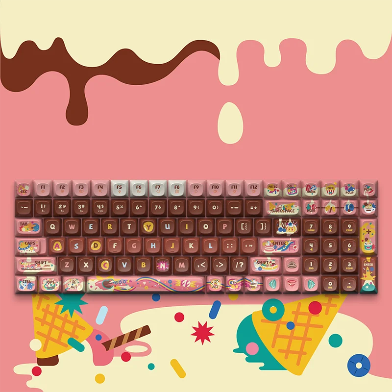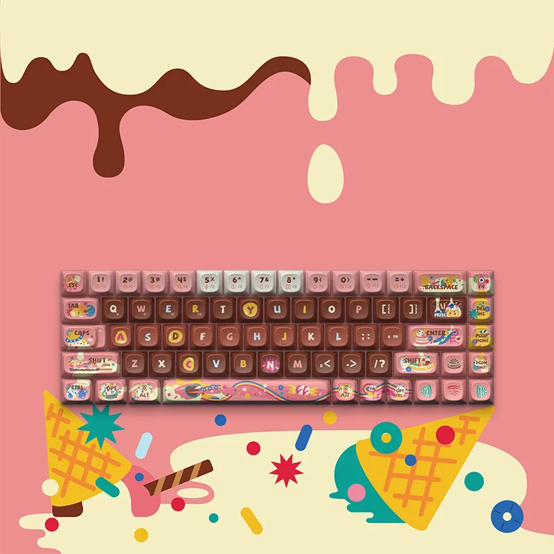 This must be keycaps from Charlie's Chocolate Factory, Look forward to finding your own Golden Ticket on every keystroke.A Splash of Sweetness on Every StrokeInspired by the whimsical world of colorful candies, our SweetDessert Keycaps create an intoxicatingly sweet vista. Just like stepping into the center of a candy world, looking down at your keyboard becomes an immersive experience of sweet assault. Vivid candy, flowing chocolate, and other yummy desserts across keycaps bring an irresistible charm to your typing journey. Each keystroke feels like a dip into a pool of your favorite treats, making it impossible to resist the allure of this playful, yet profoundly pleasing design.